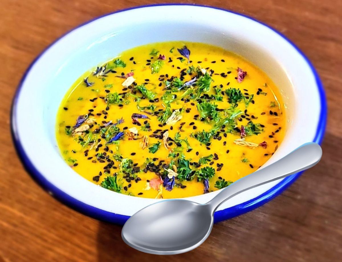 Enjoy your Butternut Squash Soup with Vegetable Broth and Garlic Rosemary Croutons!